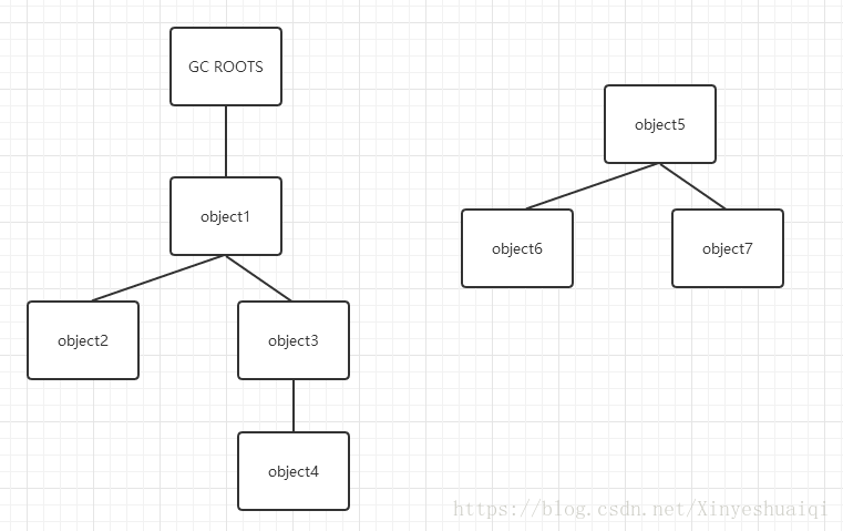 GC ROOTS 到object5 ,object6,object7没有通路,即对象不可达,则判定为可回收的对象