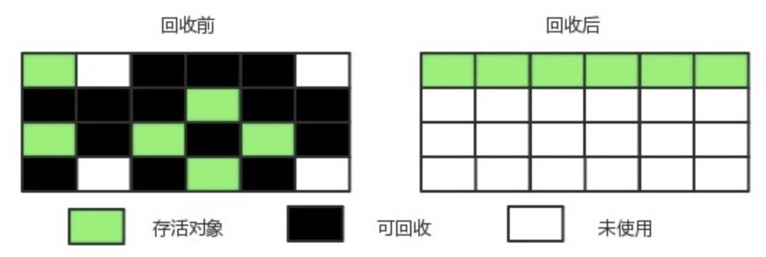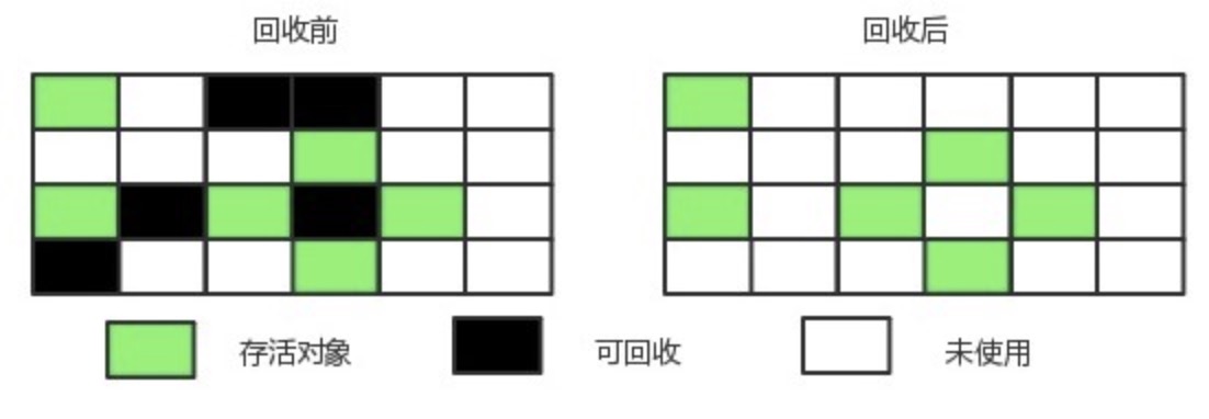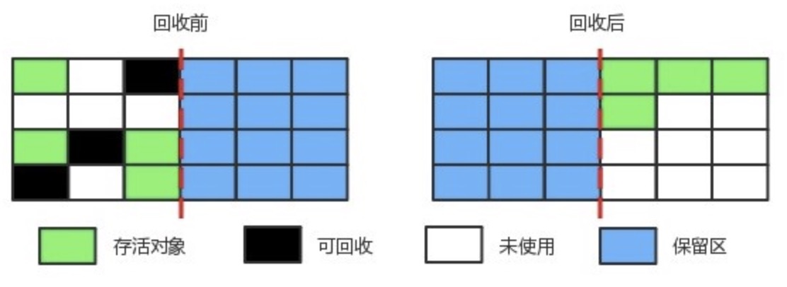 什么叫规整 —–>  所有用过的内存放在一边,空闲的内存放在另一边,中间放着指针作为分界点的指示器