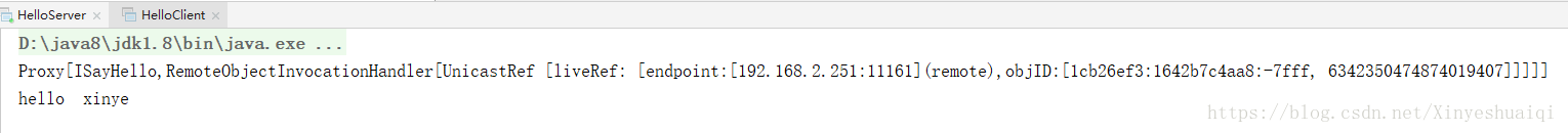 ISayHello hello =(ISayHello)Naming.lookup("rmi://localhost:8888/sayHello"); //代理对象