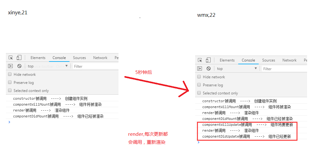 props 或者 state的变化会导致更新,当一个组件被重新渲染时,下面这些方法将被调用: