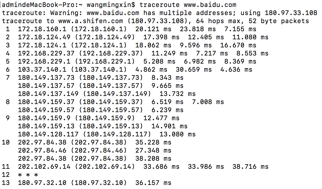 记录按序列号从1开始,每个纪录就是一跳 ,每跳表示一个网关,我们看到每行有三个时间,单位是 ms,其实就是-q的默认参数。探测数据包向每个网关发送三个数据包后,网关响应后返回的时间;如果您用 traceroute -q 4 www.58.com ,表示向每个网关发送4个数据包。
