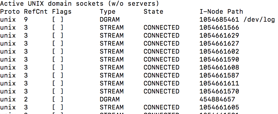 Proto显示连接使用的协议,RefCnt表示连接到本套接口上的进程号,Types显示套接口的类型,State显示套接口当前的状态,Path表示连接到套接口的其它进程使用的路径名。