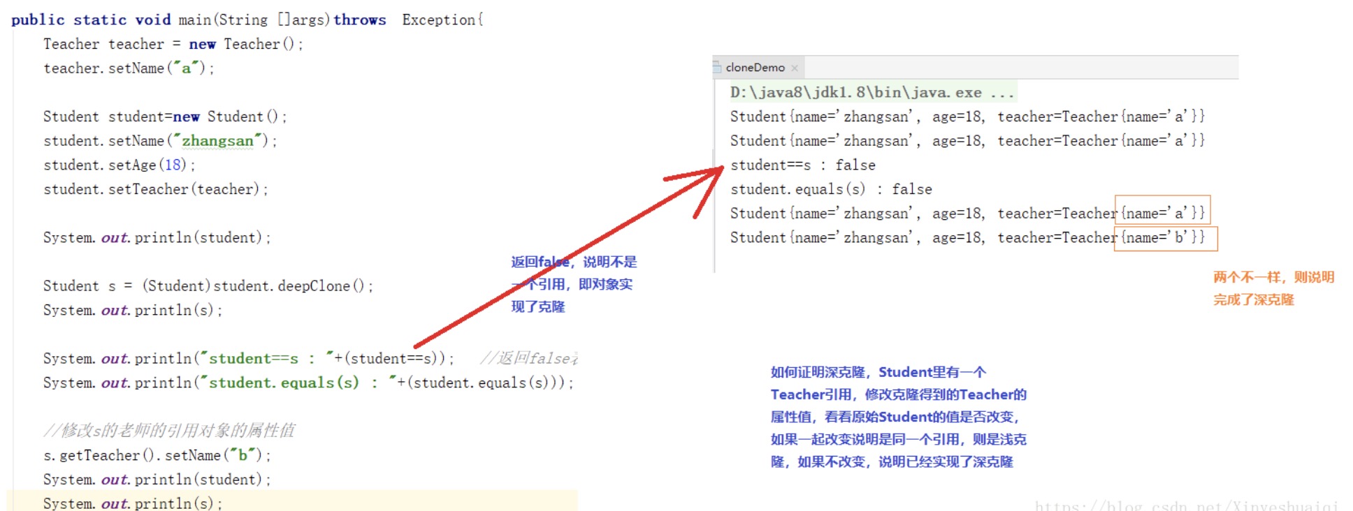 System.out.println("student==s : "+(student==s)); //返回false表示不是指向同一个对象,即深度克隆