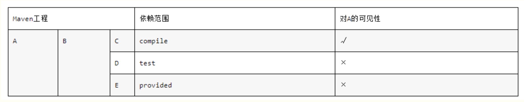 最左一列表示第一直接依赖的范围,最上一行表示第二直接的范围