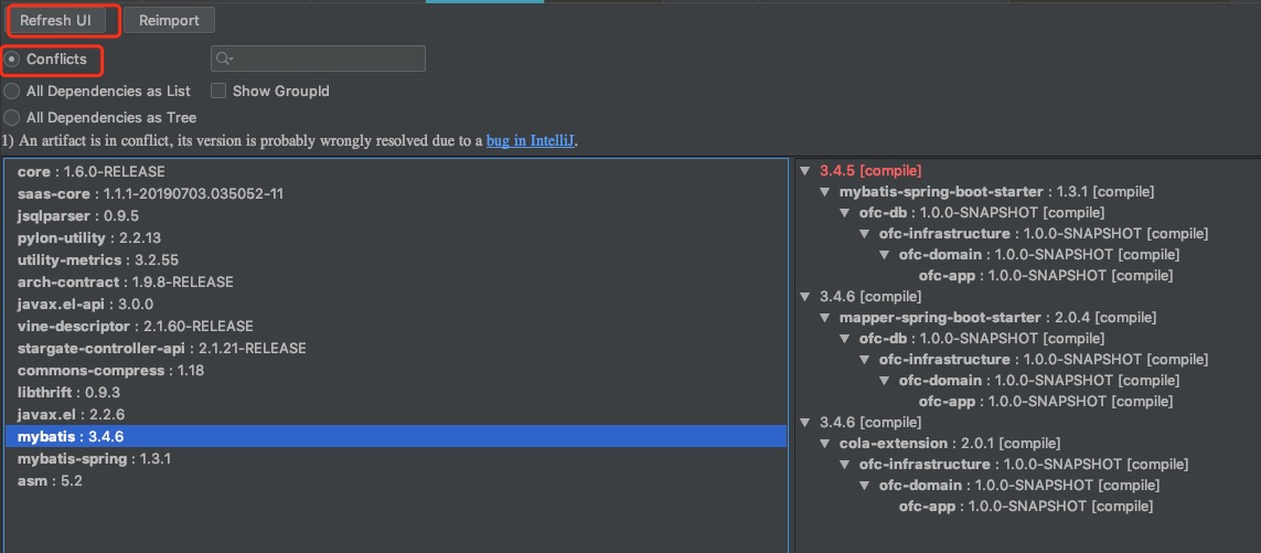 找到红线的依赖就是有问题,也可以看到冲重复的依赖