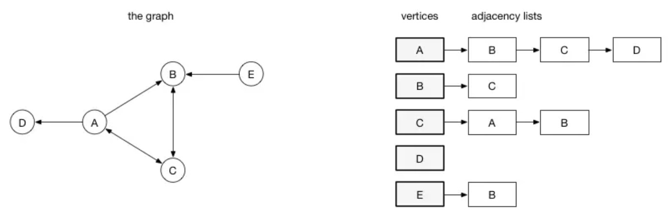 临接表,因为矩阵太占内存资源,比如有2亿个用户,2亿用户间的关系用图表示,是一个稀疏图