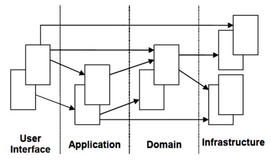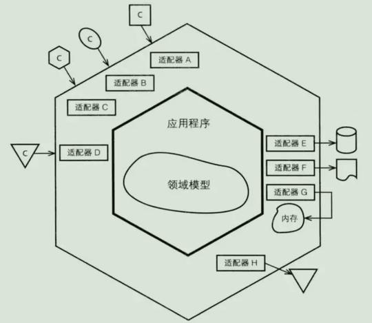 在这种架构中,系统通过适配器的方式与外部交互,将应用服务于领域服务封装在系统内部。