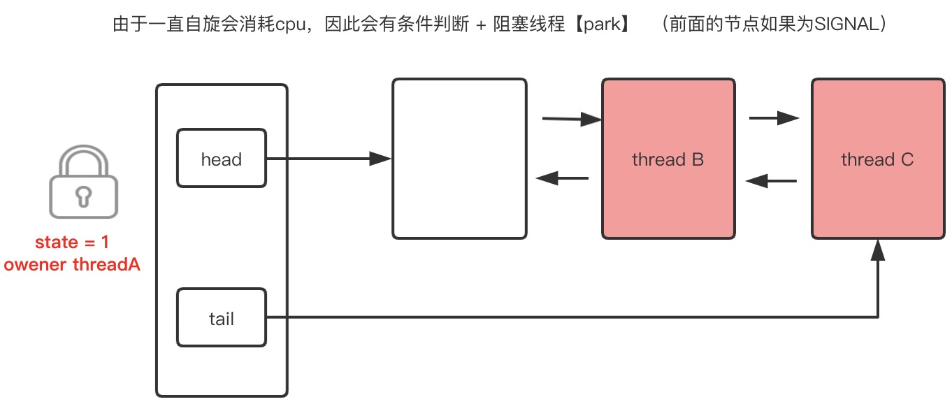 2,队列存放没有争抢到锁的线程,自旋,由于消耗cpu,需要被挂起 LockSupport.park