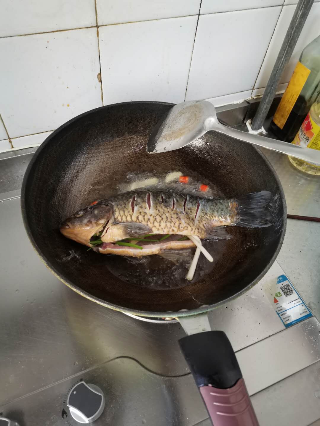 煎一小会要记得翻一面,再煎,煎至两面金黄,在鱼四周放入姜、蒜瓣、葱段、红辣椒,几粒花椒,花椒可去味