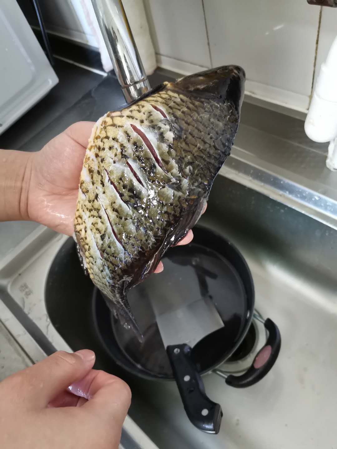 把鱼两侧用刀划开,鱼两侧和鱼肚里都滴些料酒去腥味,再洒点盐,腌制5-10分钟
