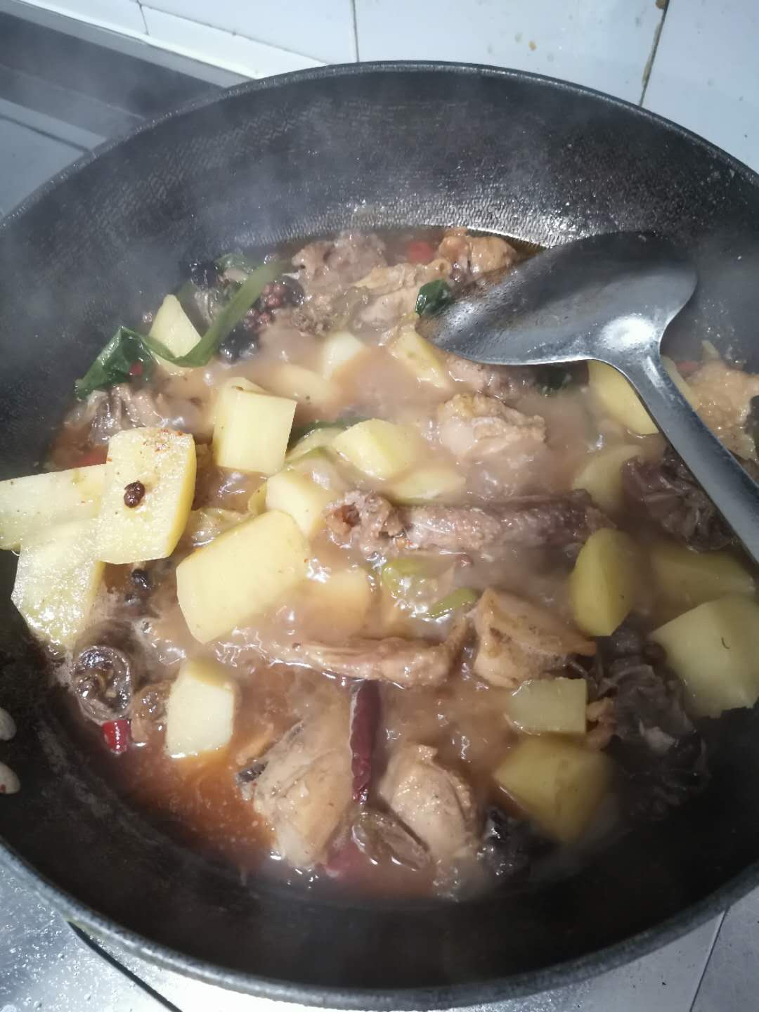 然后直接在锅中倒入烧开的热水,差不多快盖过鸡块即可,中火炖40分钟,放入土豆块,这时候因为水差不多炖干了,再加点水差不多盖住土豆和鸡肉