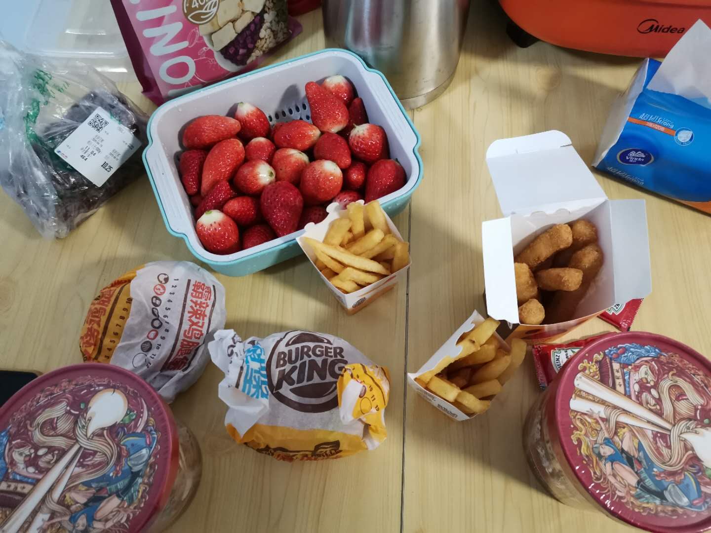 吃的有点杂,汉堡、薯条、鸡条、酸辣粉、草莓、黏糕,撑死了!