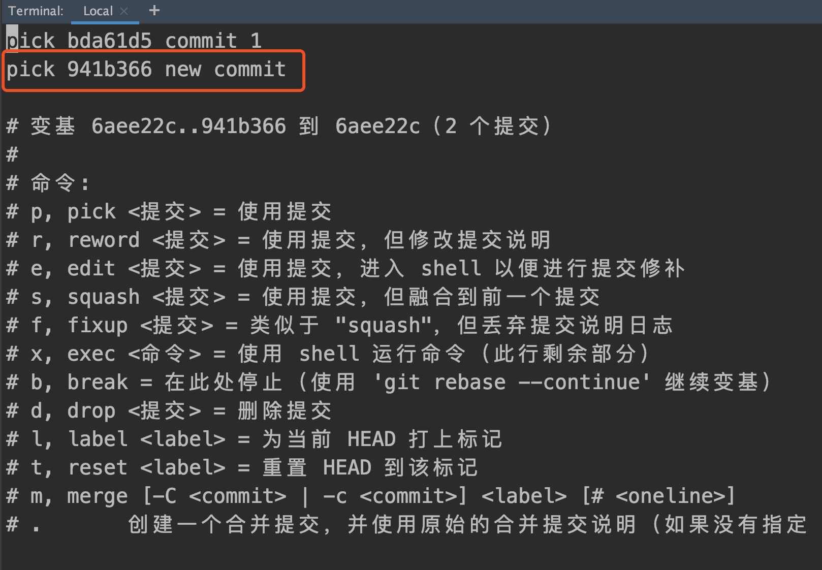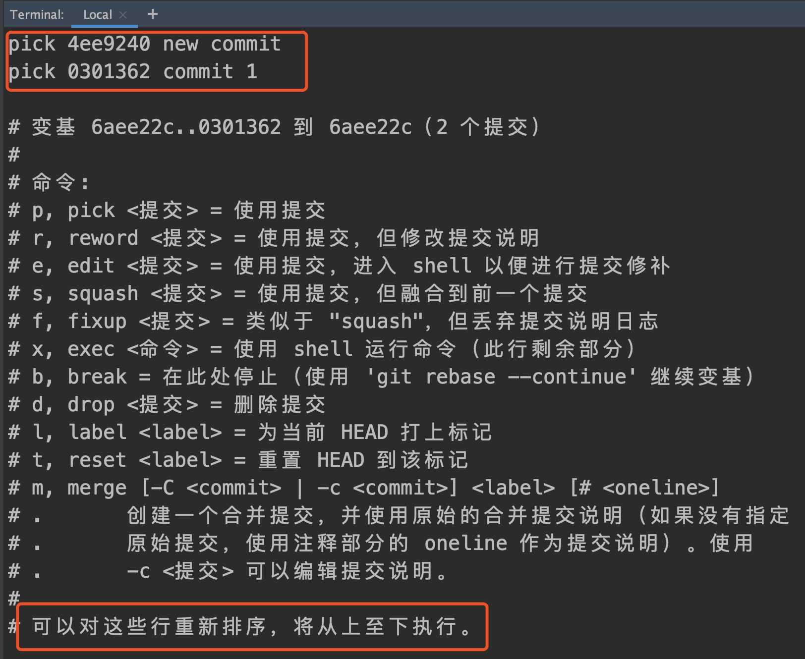 把这两行调换顺序即可,new commit本来是新的提交,在第二行,我们把它换到第一行,保存退出
