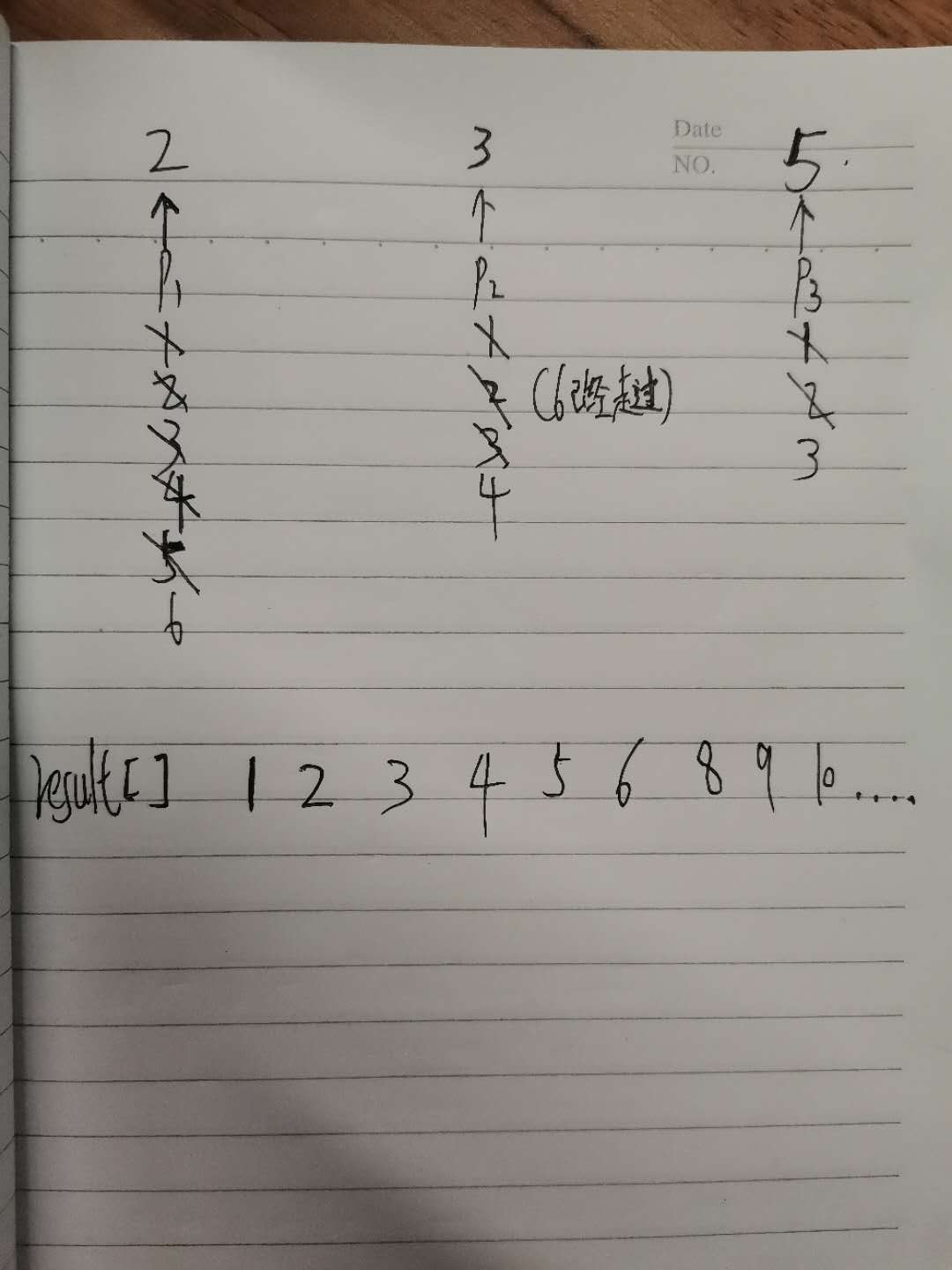 if(result[i] == result[p5]*5)p5++;//为了防止重复需要三个if都能够走到