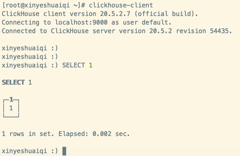 新开一个命令行,可以使用命令行客户端连接到服务: clickhouse-client