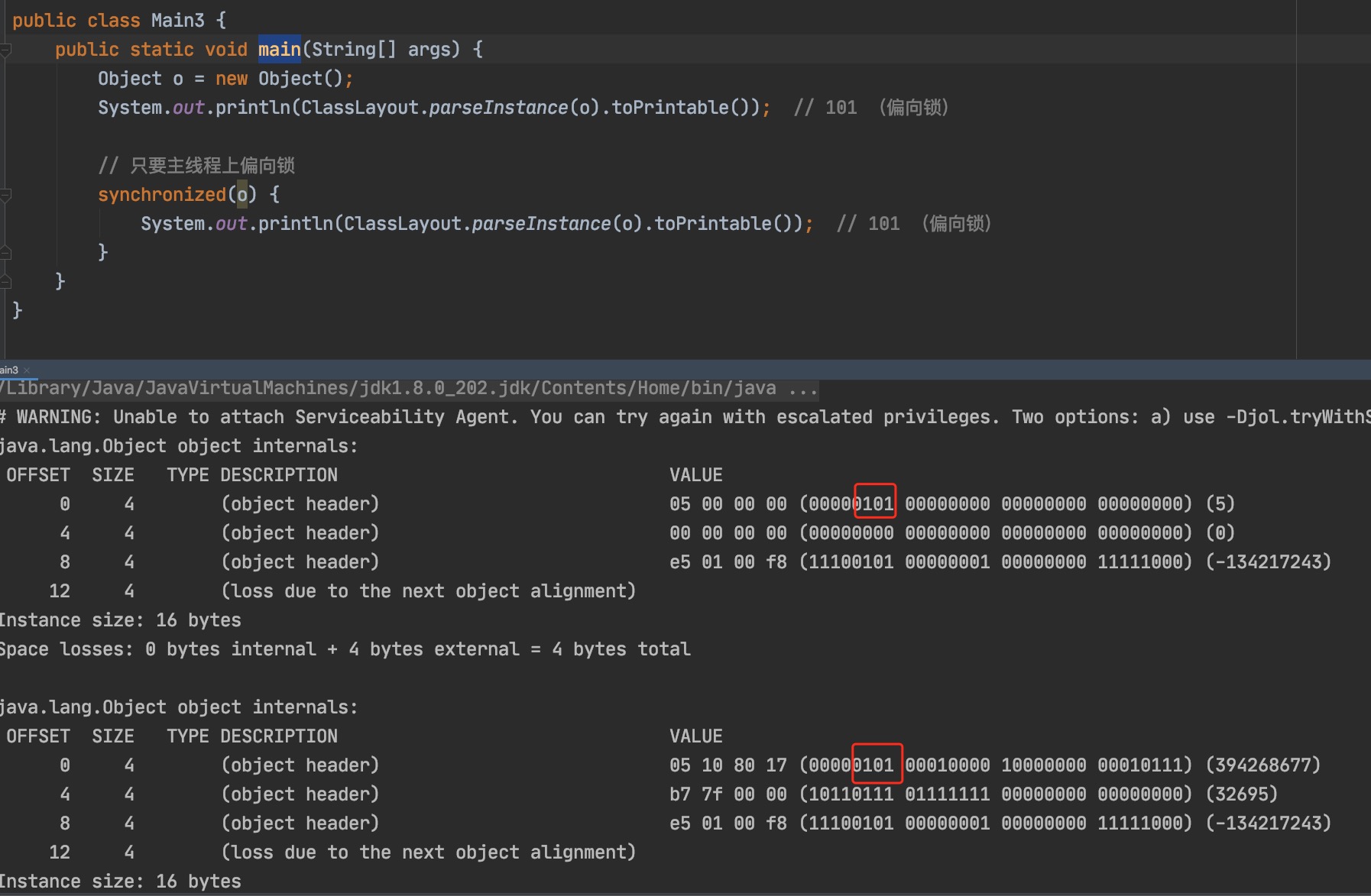 System.out.println(ClassLayout.parseInstance(o).toPrintable()); // 101 (偏向锁)