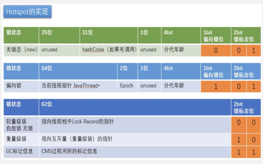 偏向锁 – markword 上记录当前线程指针,下次同一个线程加锁的时候,不需要争用,只需要判断线程指针是否同一个,所以,偏向锁,偏向加锁的第一个线程 。