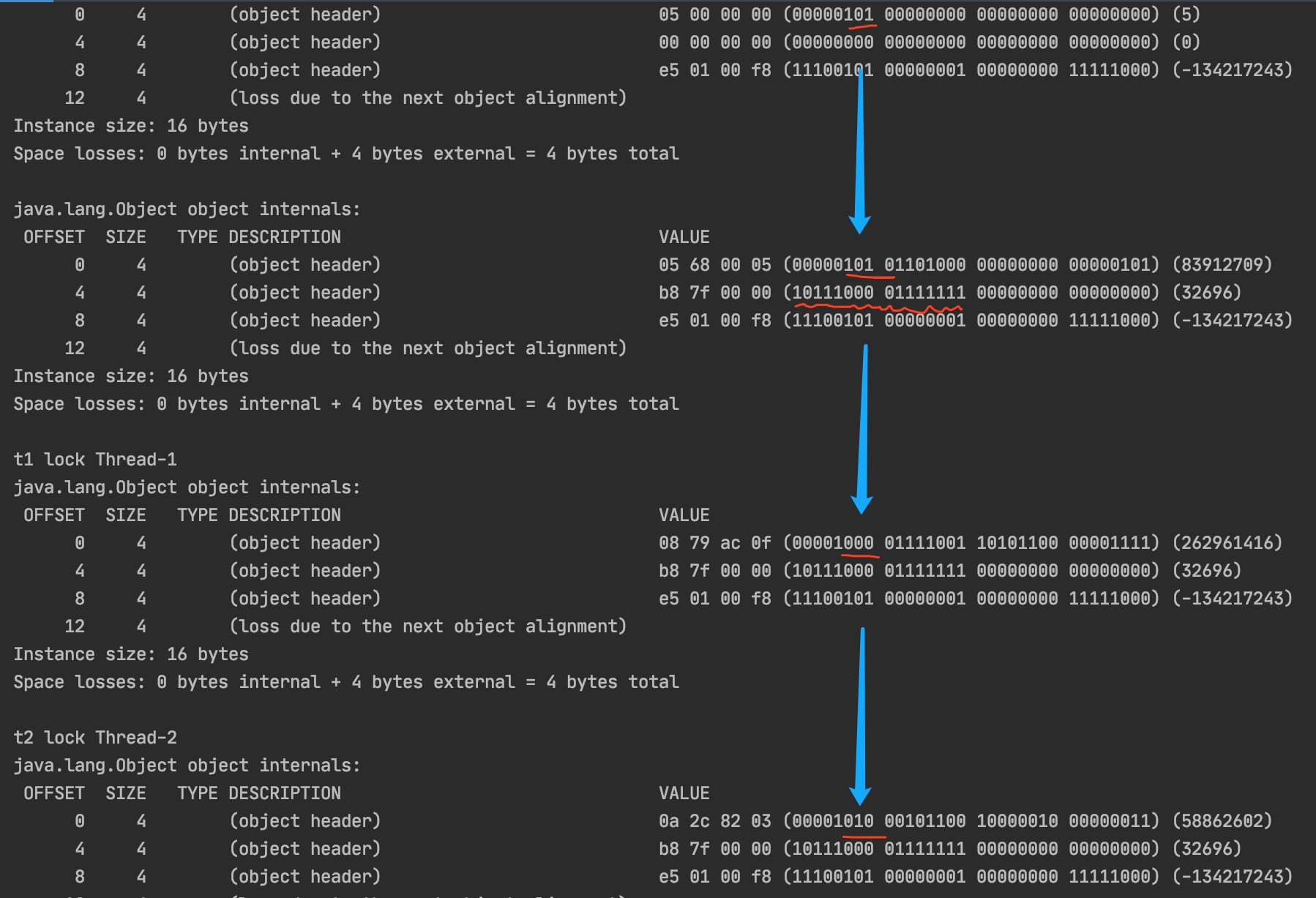 System.out.println(ClassLayout.parseInstance(o).toPrintable()); // 000 (偏向锁撤销, 升级轻量级锁)
