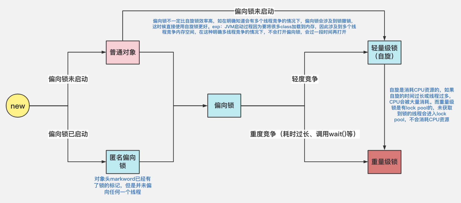 总结来说就是 new -> 偏向锁 -> 轻量级锁 -> 重量级锁