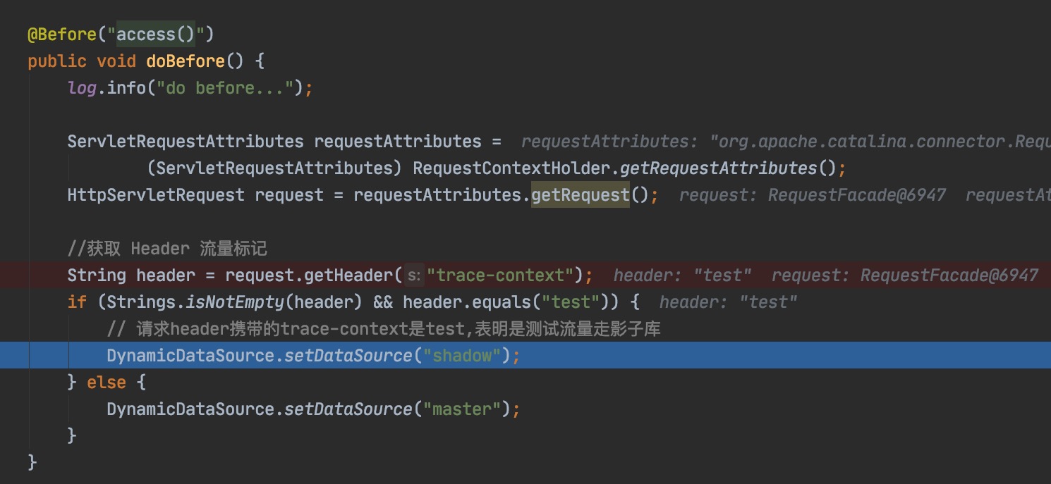 前端请求来了,我们根据前端请求header携带的标识来判断,带了测试的标识说明就说测试流量,走影子库