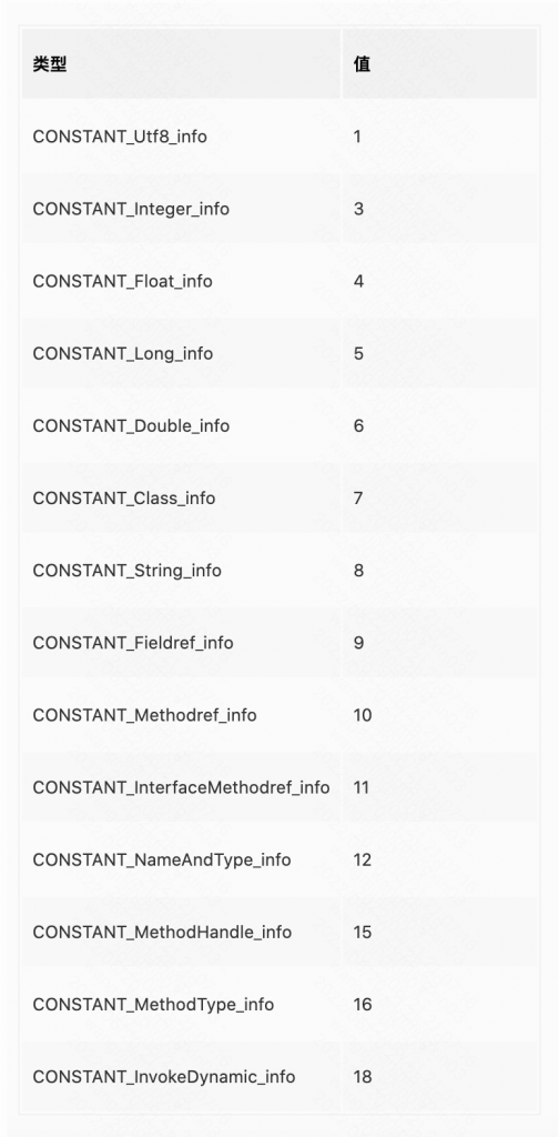 每个常量项都由两部分构成:表示类型的 tag 和表示内容的字节数组