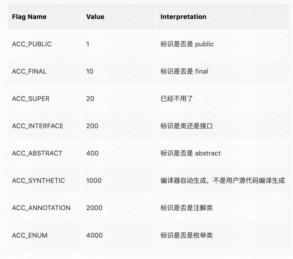 常量池之后存储的是访问标记(Access flags),用来标识一个类是是不是final、abstract 等,由两个字节表示总共可以有 16 个标记位可供使用,目前只使用了其中的 8 个。