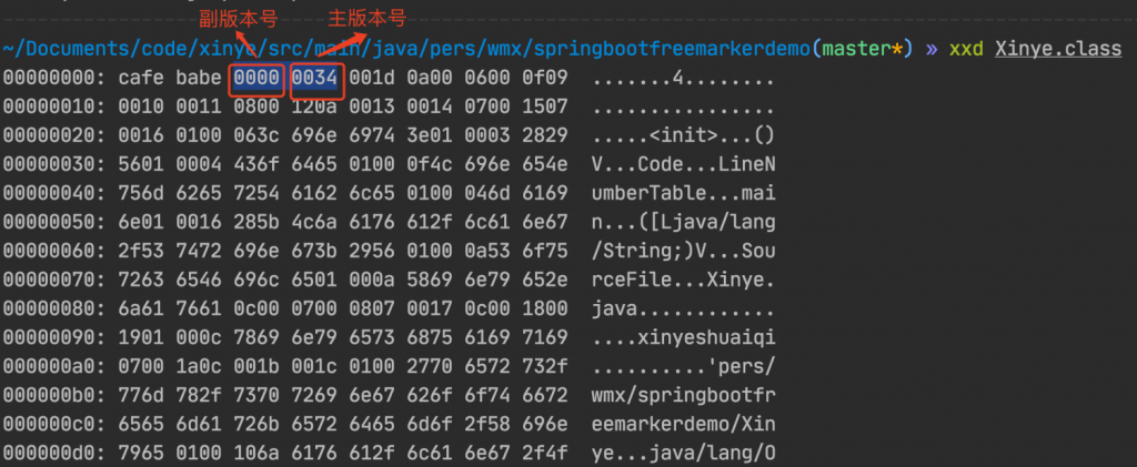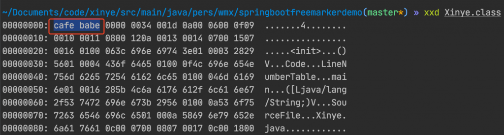 用xxd 命令以 16 进制的方式查看这个 class 文件。