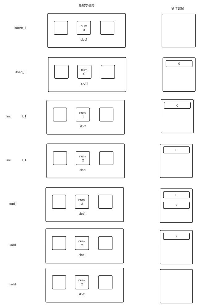 先把局部变量表的slot1 的变量num 加载出来,值为0,栈中的数是0