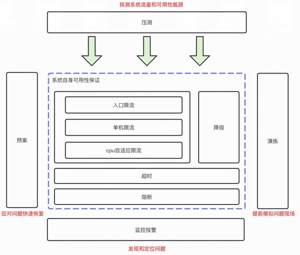 看上图,系统自身我们要配置好入口处的限流、单机限流、cpu自适应限流,对下游做好超时熔断配置,并做好降级方案